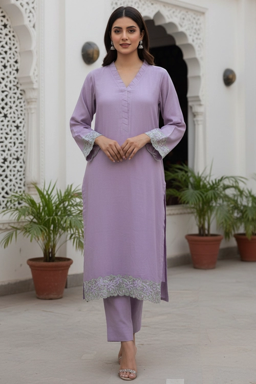 Elevate your wardrobe with this beautifully crafted Lavender Khadi Net 2 Piece Suit, designed for women who appreciate elegance with comfort. Made from breathable Khadi Net fabric, this outfit offers a lightweight and refined look ideal for warmer seasons.