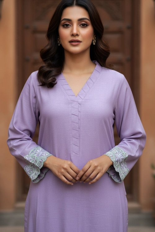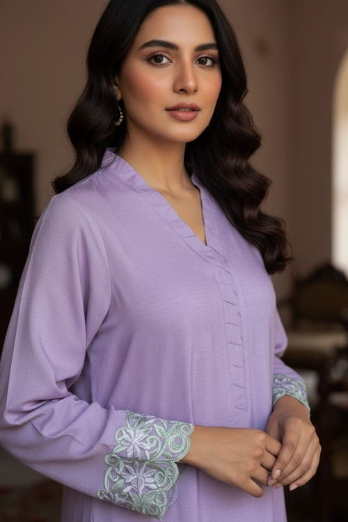 The soft pastel lavender shade enhances its graceful appeal, while the delicate lace detailing on the sleeves and hem adds a subtle touch of sophistication. Paired with a straight trouser, this ensemble creates a balanced and timeless silhouette.
